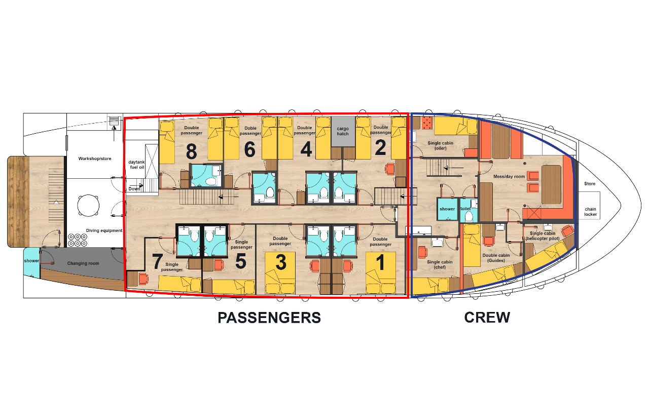 Accommodations | 6 double cabins | 2 single cabins | All with ensuite bathrooms | |