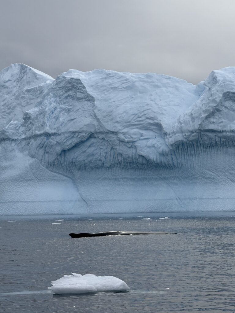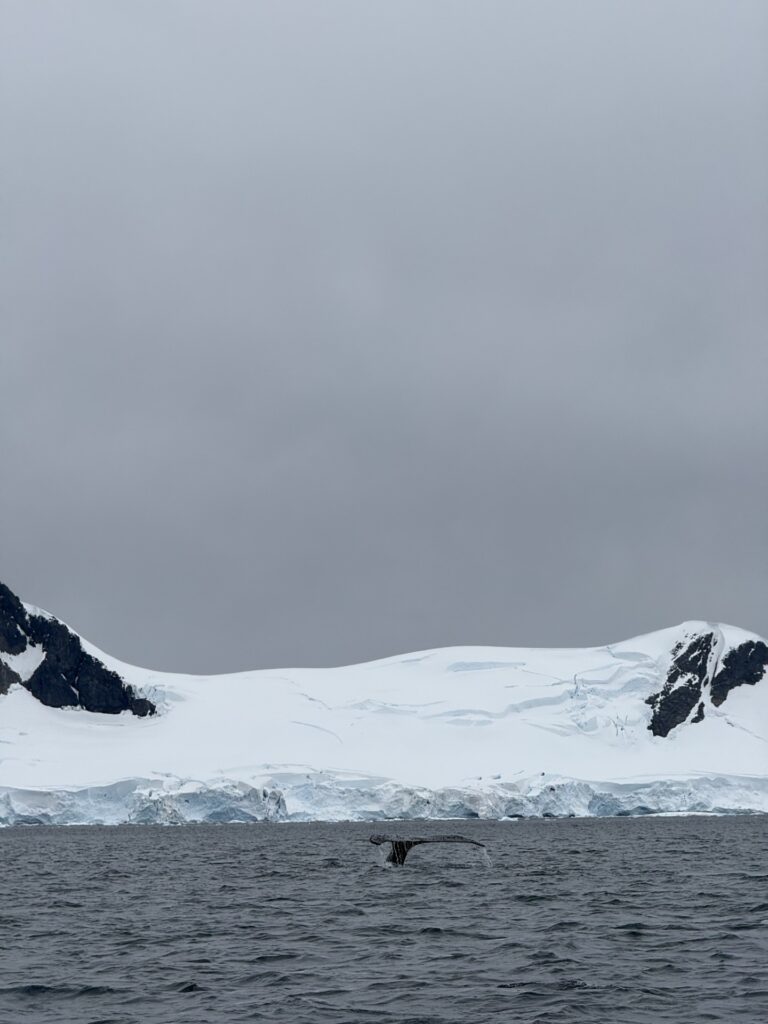 Day 7 of our incredibly phenomenal Antarctic adventure had us wake up in Paradise Harbor to pancakes with berries, pears, bananas, and eggs and bacon. Off at 9:30 for a Zodiac tour that started with a bang…the crack of a calving iceberg. We heard it, but did not see it. Weather was overcast, dry, in the low thirties and some wind. Within minutes we saw porpoising penguins. Matias, who speaks only five languages and today was a Zodiac driver, spotted a whale. Our two zodiacs followed it at a distance. Our reward was spotting its whale tail when it dove (one of many whale tails observed on this trip). Then it was off to zodiac around Chilean research base that was home to thousands of penguins and today was overrun by green-parka-ed tourists from the large cruise ship World Traveller. This prompted someone to observe that we were glad to be on the much smaller Hans Hansson that did not require everybody to wear the same color parka. We Zodiac-ed on to another large gentoo penguin colony. We then Zodiac-ed back to the Hans Hansson.
