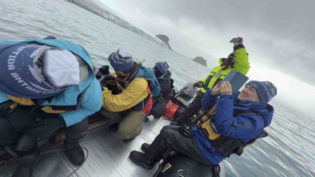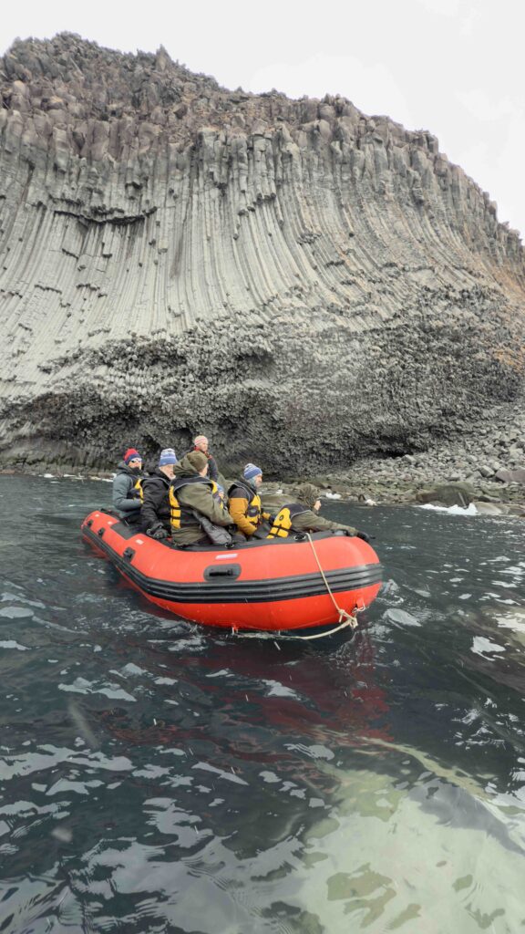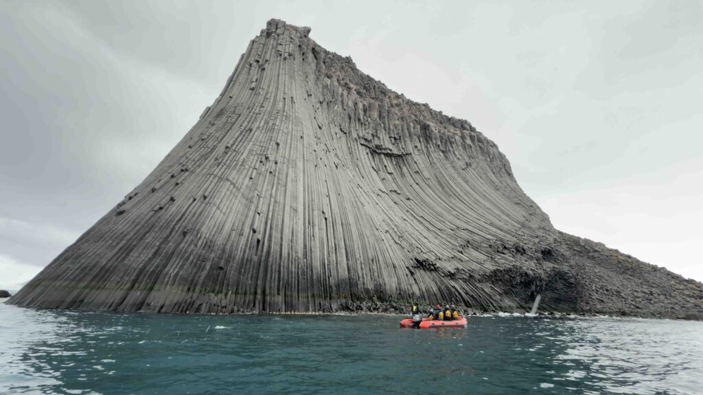 During lunch, we’ve moved a bit further away and are now at our second stop for the day, Edinburgh Hill. It’s a cool basalt rock formation that sticks out of the sea. From our Zodiacs, we’re checking it out. It looks a bit like Devil’s Tower in Wyoming, which was in the movie Close Encounters.
