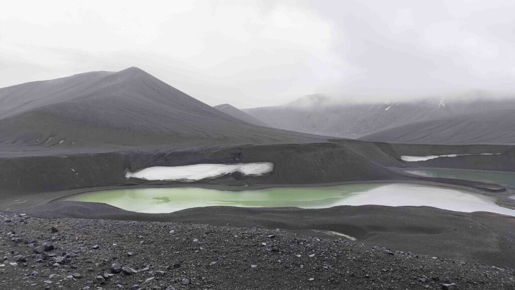 After a long days motoring yesterday and a quiet night spent at Deception Islands Port Faster (Whalers Bay) It was nice to get ashore at Telfon Bay. From the beach we walked up the gentle scree slope to the crater rim of the volcano that last erupted in 1969/70. Unfortunately the cloud descended which restricted our view of the rugged and spectacular landscape.