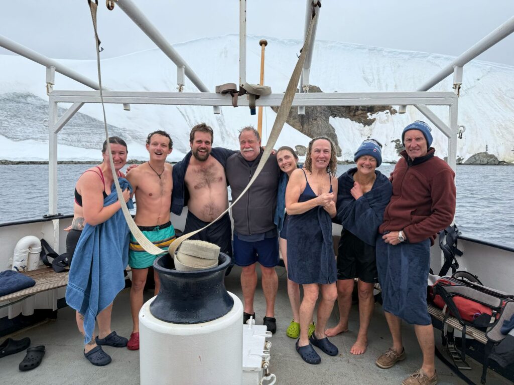 At the end of our expedition day … it was time to do the …. POLAR PLUNGE!!! As we were preparing ourselves mentally over and over … we headed to the stern of the boat where the zodiac and crew were waiting. With fear of how the Antarctic water would shock our bodies, we still presented this facade of strength and will as if we were penguins jumping into frigid waters…one by one, cheering each other on, we took the plunge.