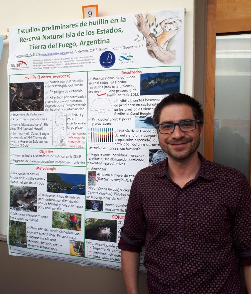 Proud? YES! Alejandro Valenzuela, has joined Ocean Tramp on two expeditions as a guest scientists, once last November 2016 and this past October to better understand the otter population on Isla de los Estados. He presented his findings this past week at the XXX Jornadas Argentinas de Mastozoología (JAM), the annual meeting of SAREM (Sociedad Argentina para el Estudio de los Mamíferos – The Argentine Society for the Study of Mammals). His poster presentation focused on initial results form the first year of studying the otters on the island.